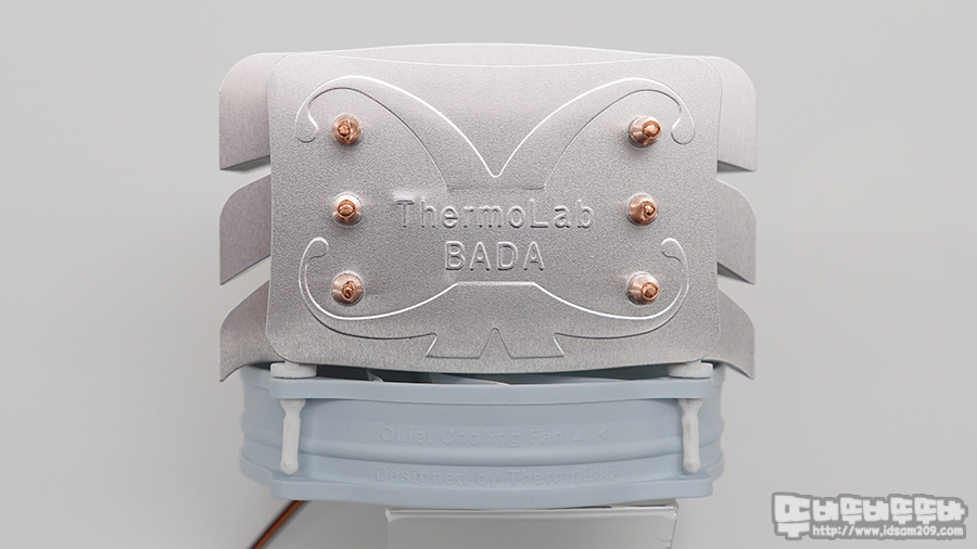 히트 싱크의 중앙부와 상/하단부의 크기가 다르게 적용된 게 특징이며 히트싱크 상단에는 브랜드 명인 써모랩과 모델명 BADA가 각인되어있네요.