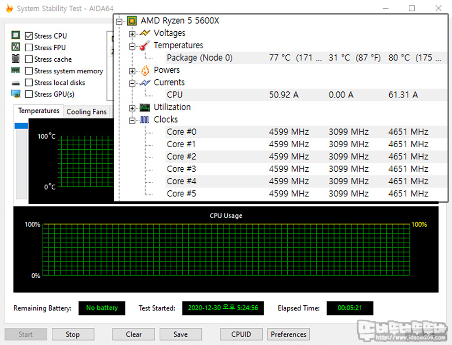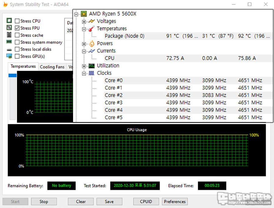 AIDA64 Stress 테스트 기본 쿨러의 온도를 체크해보면 Stress CPU 테스트에서는 80도, 부동소수점 테스트로 CPU를 극한으로 테스트하는 Stress FPU 테스트에서는 92도까지 오르는 것을 확인할 수 있는데요.