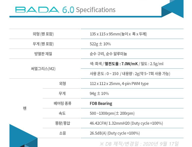 특히 BADA 6.0 CPU 쿨러는 FBD베어링이 사용된 112mm 쿨링 팬을 사용하여 500~1300 rpm으로 가변 되어 특징으로 Stress CPU 테스트에서는 570 rpm으로 작동하여 쿨링 소음이 전혀 들리지 않는 상태로 67도를 유지하며 Stress FPU 테스트에서는 1317 rpm으로 작동하면서 약간의 소음이 들리기 시작하였습니다.