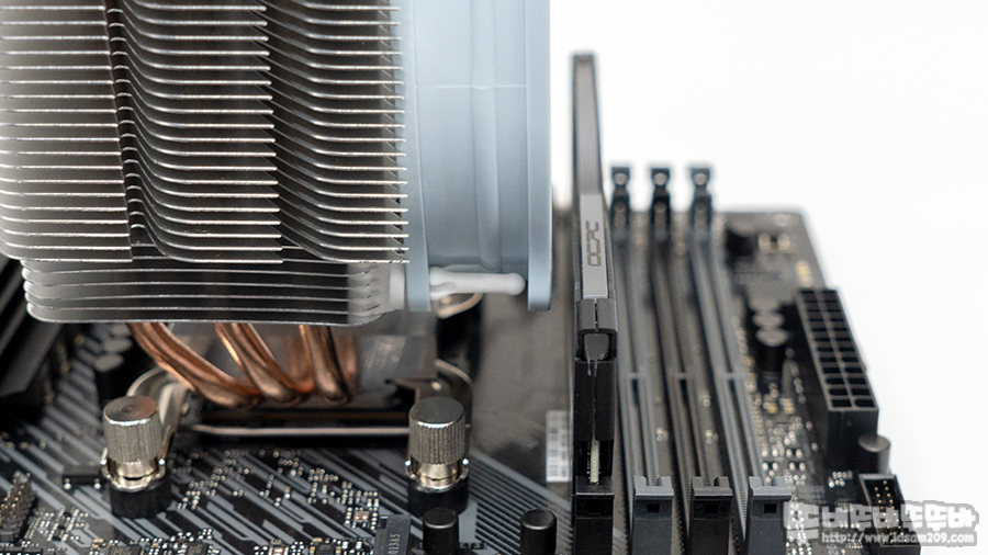 써모랩 BADA 6.0 CPU 쿨러가 좋은 점이 있다면 메모리 뱅크 1번 메모리와 간섭이 없기에 슬림한 튜닝 메모리나 약간의 볼륨이 있는 튜닝 메모리를 사용하더라고 간섭 없이 사용할 수 있습니다.