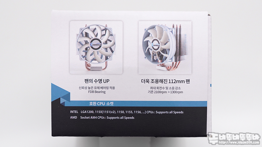 측면에는 제품의 특징인 FDB 베어링 사용과 1300 rpm의 112mm 쿨러 사용과 다양한 CPU 규격 지원 그리고 스펙 정보가 인쇄되어있습니다.