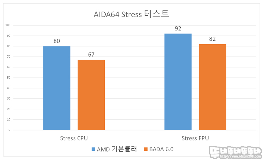 기본 쿨러와 BADA 6.0 쿨러의 온도를 비교해보면 Stress CPU 테스트에서는 13도 하락, Stress FPU 테스트에서는 10도 하락으로 기본 쿨러보다 훨씬 안정적인 쿨링 성능을 보여주었습니다.