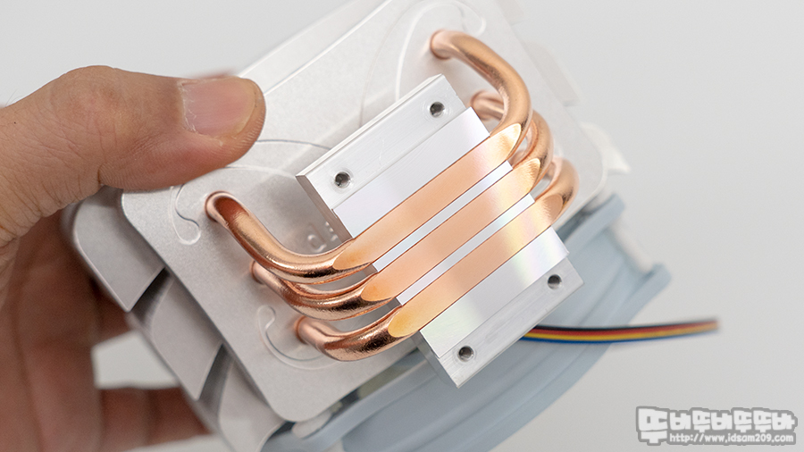 바닥면을 살펴보면 구리 재질의 히트파이프가 CPU 히트 스프레더에 직접 맞닿아 열을 빠르게 전달할 수 있게 디자인된 접촉면을 확인할 수 있습니다.