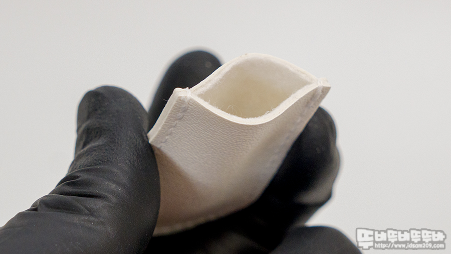 위에서 설명한 대로 왼쪽 날이 얇게 디자인되어 플라스틱을 파고드는 역할을 하기에 천천히 컷팅을 해야 부품 표면에 게이트 자국을 남기지 않고 컷팅이 가능하며 빠르게 커팅 시 일반 니퍼와 같이 단차가 있을 정도의 게이트 자국을 남김.