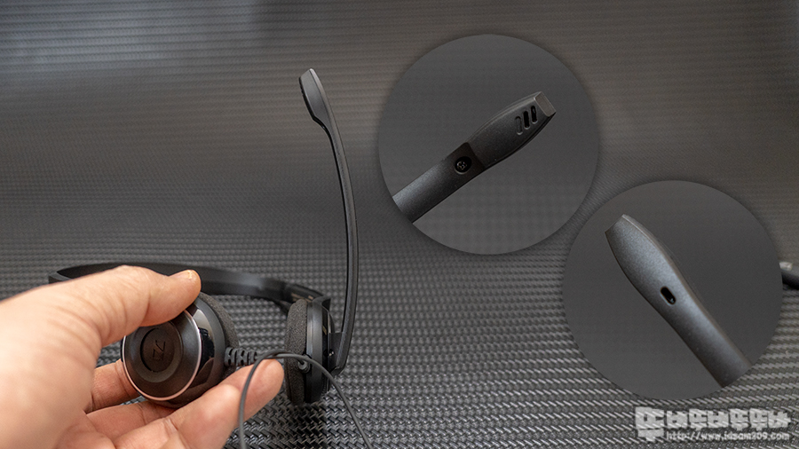 약 160도 각도로 회전이 되는 마이크는 구분감이 있는 느낌으로 회전과 적당한 위치에서 고정이 가능하며 마이크대가 안쪽으로 휘어진 디자인이라 헤드셋 착용 시 입술에 근접한 위치에 마이크가 위치하게 됩니다.