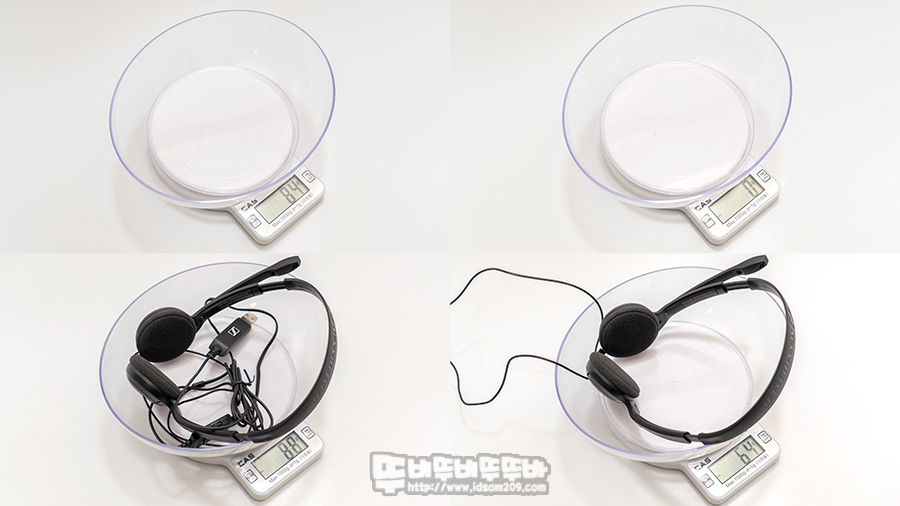 헤드셋 전체 구성을 측정 시 88g, 케이블을 제외하고 측정 시 64g으로 확인되며 실제 헤드셋 착용 시 밑으로 늘어지는 케이블에 약간의 무게가 가중되기에 위에 측정한 2개의 무게 중 중간 정도로 보시면 될 거 같습니다.