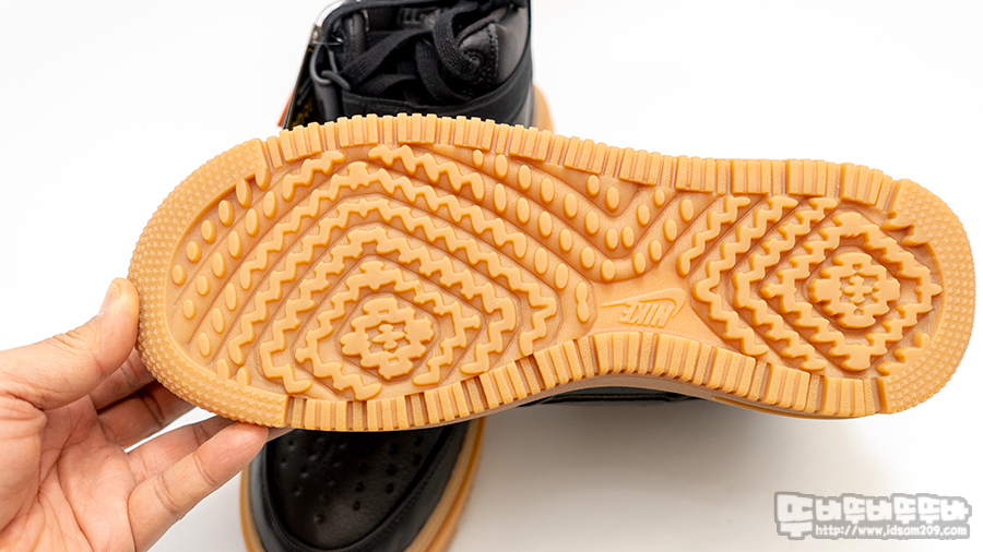 오리지널 제품은 밑창의 골이 밋밋해서 눈이면 미끄럼이 있지만 에어 포스 1 하이 GORE-TEX 부트는 겨울용 타이어 느낌으로 착용할 수 있었네요.