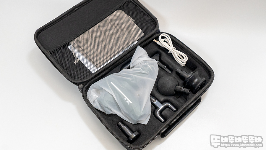 제품의 구성으로는 충전 케이블 (아답터는 미제공), 사용 설명서, 벨벳 파우치, 6개 마사지 헤드( 플랫, U, 타워, 라운드 볼, 스크래처, 원뿔)로 구성되어 있으며 아쉽게도 전원 아답터는 제공하지 않습니다.