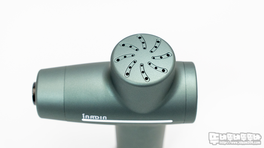 마사지 건의 상단 부는 모터가 구동 시 발생하는 열기를 배출하는 환기구로 디자인되었으며 바닥면에는 전원 충전용 소켓과 전원 On/Off 스위치로 구성되어있고요.