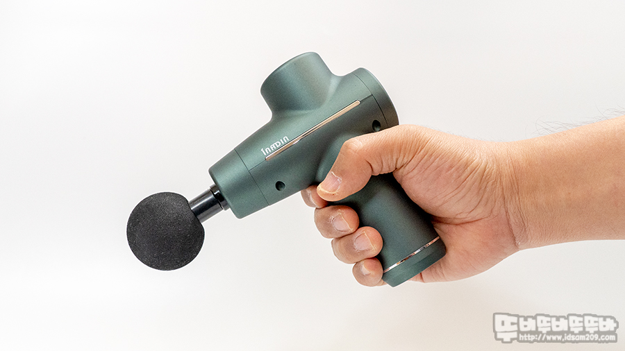 반면에 인앤인 파사아 미니 마사지 건은 한 손 그립 시 무게가 그렇게 느껴지지 않는 디자인으로 상당히 가벼움을 느낄 수 있습니다.