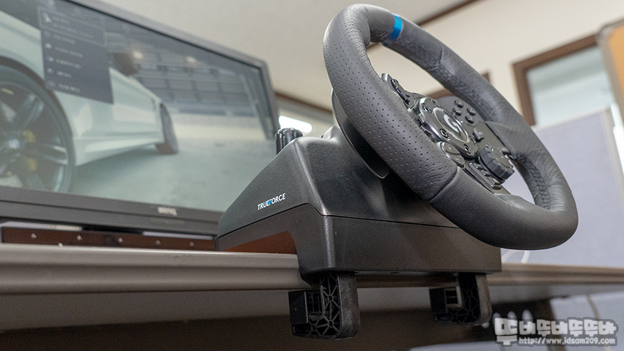로지텍 G923 레이싱 휠 클램프를 이용하여 고정한 모습.