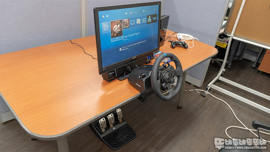 사무실 책상이 오피스용으로 상판 모서리가 경사진 형태로 되어있어 장착이 불가능하여 부득이하게 회의용 테이블로 세팅하고 레이싱 휠을 장착했습니다.