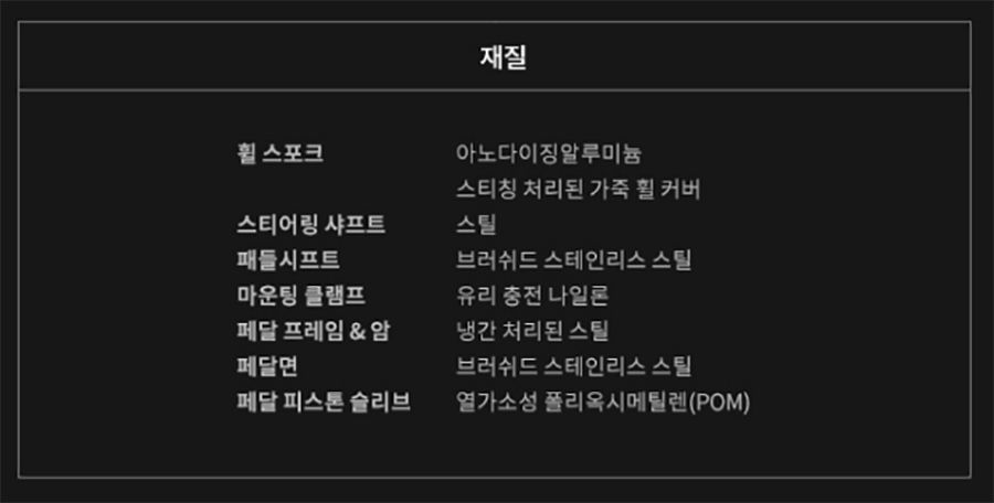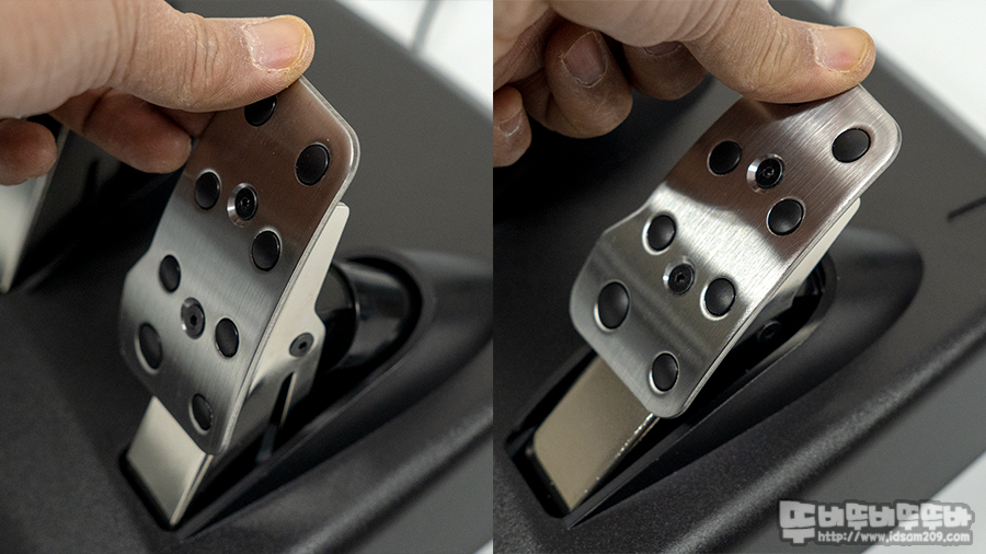 엄지손가락으로 눌렀을 때 들어가는 강도는 액셀레이터 > 클러치> 브레이크 순으로 브레이크는 손바닥으로 눌러도 잘 눌리지 않는 강도를 가지고 있습니다.