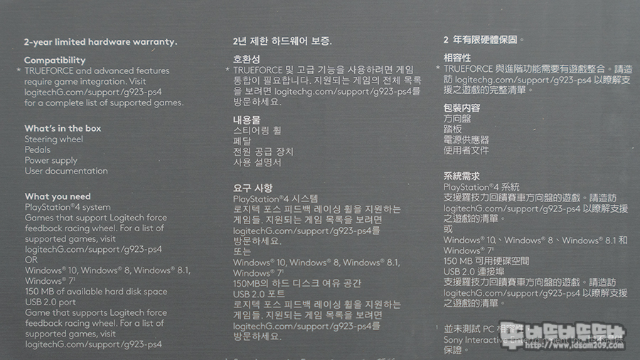 패키지 측면에는 차세대 포스 피드백에 대한 설명과 게임의 물리엔진 및 오디오에 반응하는 트루포스의 장점을 소개하고 있으며 다른 측면에는 레이실 휠의 구성에 대한 표기가 인쇄되어있습니다.