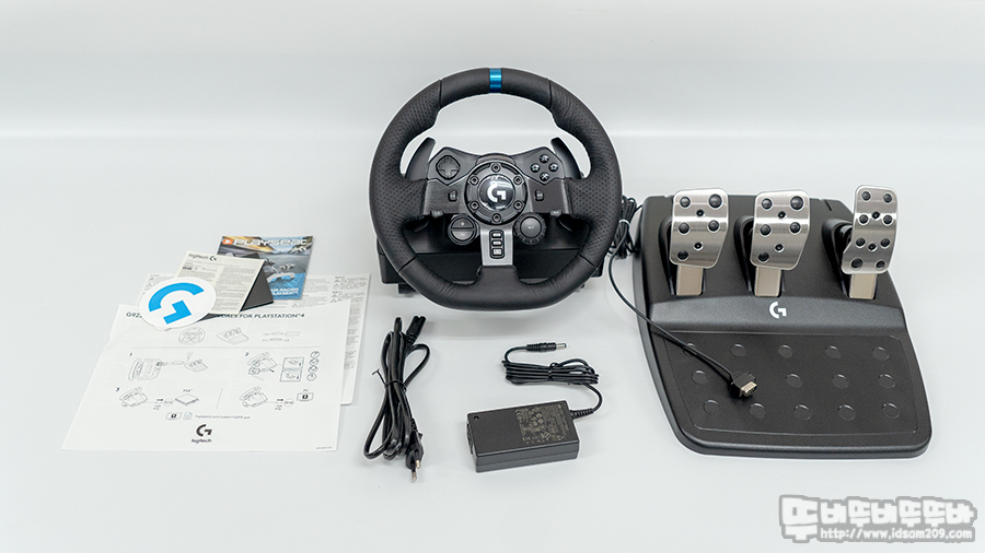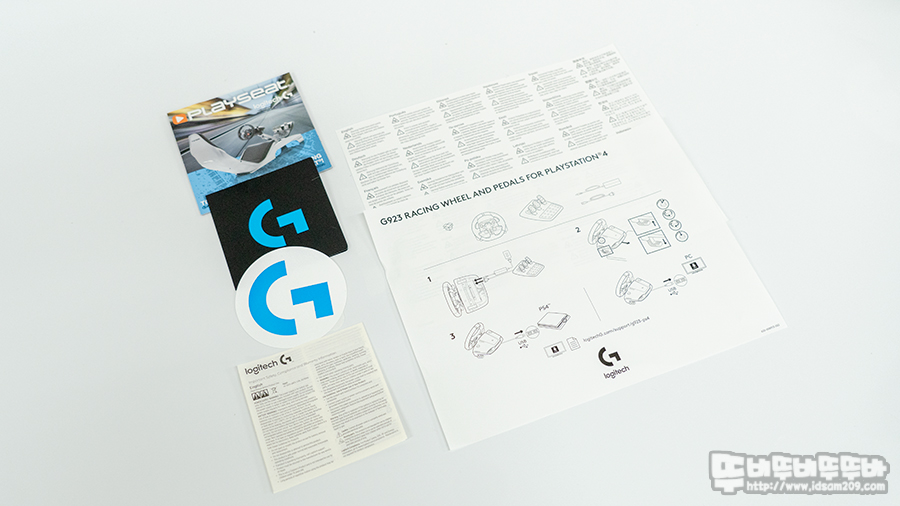 제품의 구성으로는 로고 스티커와 설치 가이드, 레이싱 휠 본체와 전원 아답터, 전원 코드, 페달로 구성되어있습니다.