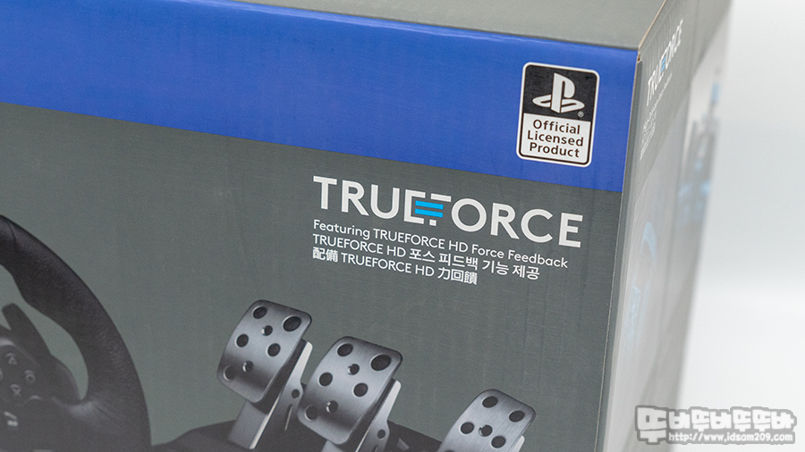 PS4 호환 제품임을 블루 라인에 PS4로고와 레이싱 휠 및 페달이 들어있는 문구 그리고 TRUEFORCE HD 포스 피드백 기능 제공에 대한 내용을 확인할 수 있습니다.
