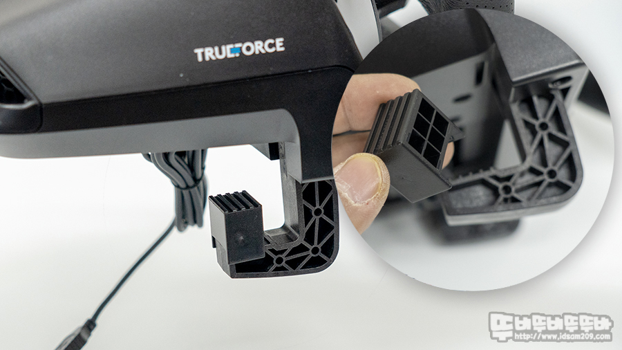 왼쪽에 수동기어 (드라이빙 포스 시프트) 장착 부(별도 구매), 오른쪽에는 페달 연결부(기본 구성), 그리고 전원 아답터를 연결하는 소켓으로 구성되어있으며 중앙 부분에 케이블을 고정할 수 있는 4개의 가이드 홀을 확인할 수 있습니다.