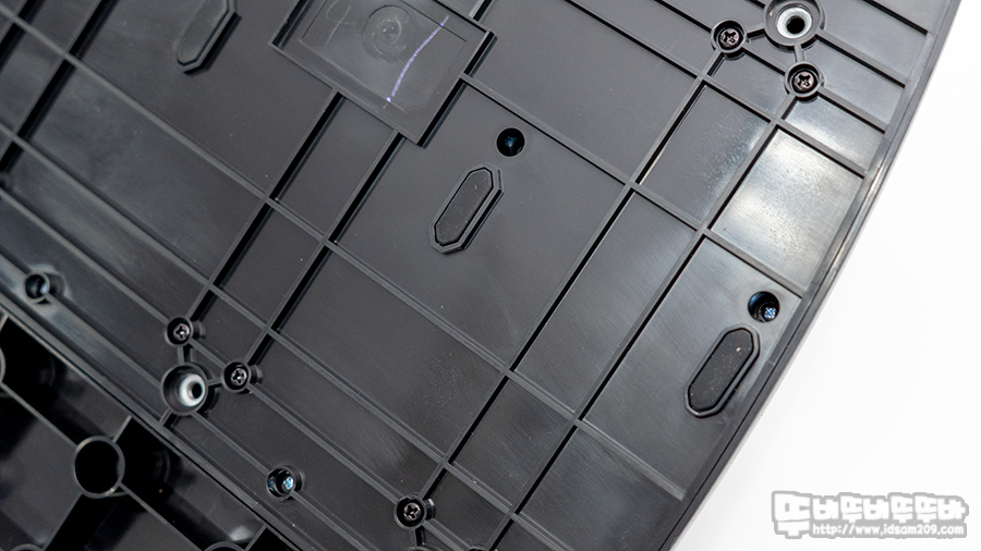 그 외에는 레이싱 휠 바닥면과 마찬가지로 레이싱 체어 구축 시 고정을 할 수 있는 나사 홀과 일반 가정집에서 사용 시 미끄럼 방지 패드 구성으로 되어있는 것을 확인할 수 있습니다.