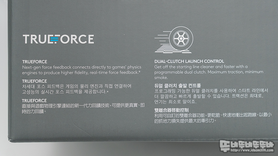 패키지 뒷면 하단에는 트루포스 시스템과, 듀얼 클러치 출발 컨트롤, 레이싱에 최적화된 스펙, 24 포인트 셀렉터, 온휠 컨트롤, RPM LED 및 레이싱 컨트롤 등 제품의 특징을 요약하여 인쇄한 것을 확인할 수 있습니다.