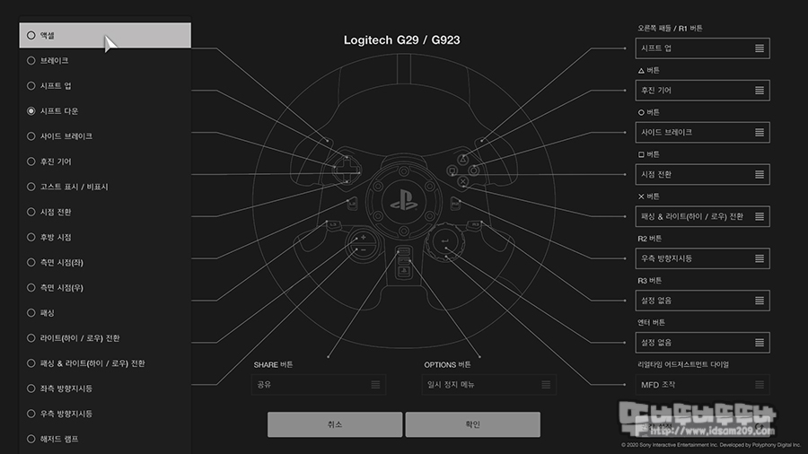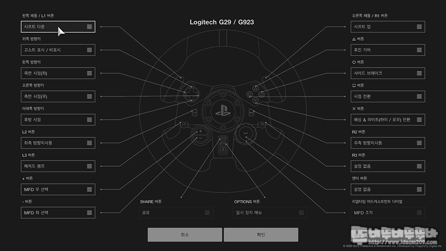 게임 메뉴에서 핸들 관련 버튼 기능을 변경할 수 있는 기능을 지원하기에 레이싱 휠 모델을 G92 / G923을 선택하여 버튼의 기본 기능을 확인하고 기능을 변경하고자 하는 버튼을 눌러 원하는 기능으로 변경이 가능하지만 초심자에게는 기본 기능으로 사용해보시고 숙달이 되면 사용자 편의에 따라 변경하는 걸 추천드립니다.