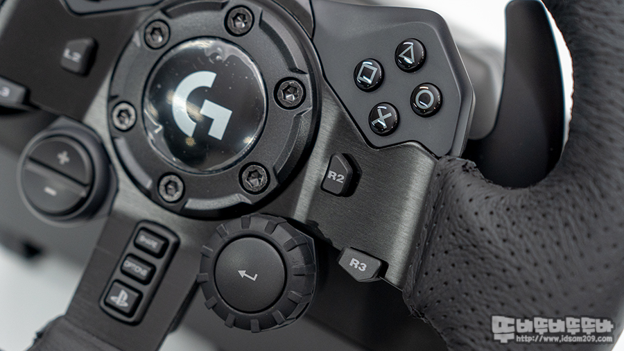 중앙 컨트롤러 상단 부분은 PS4 컨트롤러에서 볼 수 있는 십자 컨트롤러와 버튼 구성 그리고 중/하단 부에는 L/R 버튼류, 쉐어 / 옵션 / PS버튼 그 외 24 포인트 셀렉터와 엔터 버튼, +/- 버튼으로 구성되어있습니다.