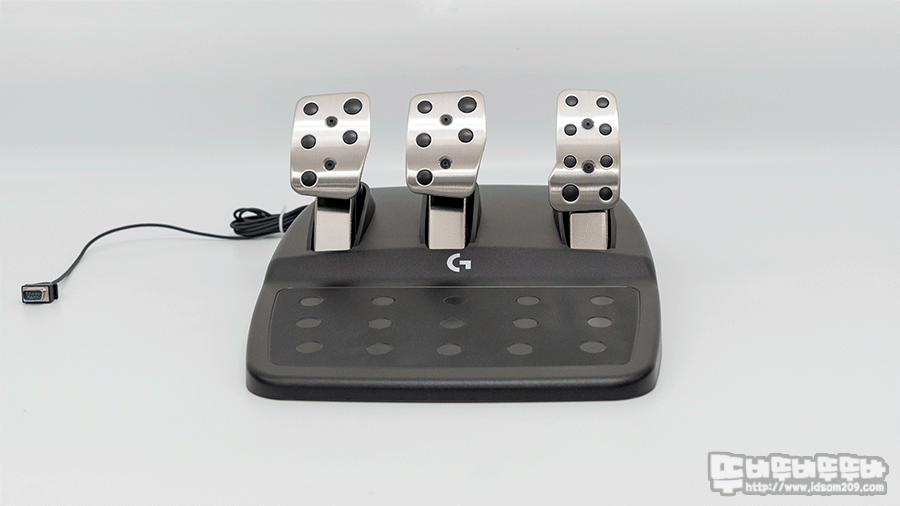 연결 커넥터는 시리얼 포트를 사용하고 있으며 케이블 길이는 약 2.4m로 페달을 바닥에 두고 책상에 거치된 로지텍 G923 레이싱 휠 본체에 연결하기에 꽤 넉넉한 길이를 제공하고 있습니다.