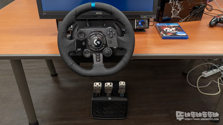 책상에 고정한 로지텍 G923 레이싱 휠을 기준으로 오른쪽 발 위치에 놓은 페달을 놓았습니다.
