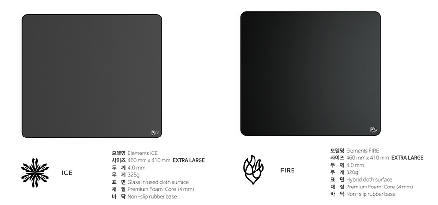 글로리어스 Elements는 러버 베이스의 ICE, FIRE, 얇은 플라스틱 베이스의 AIR 3가지 모델로 출시했으며 국내에는 아이스와 파이어 패드를 우선 출시 후 에어를 출시할 예정입니다.