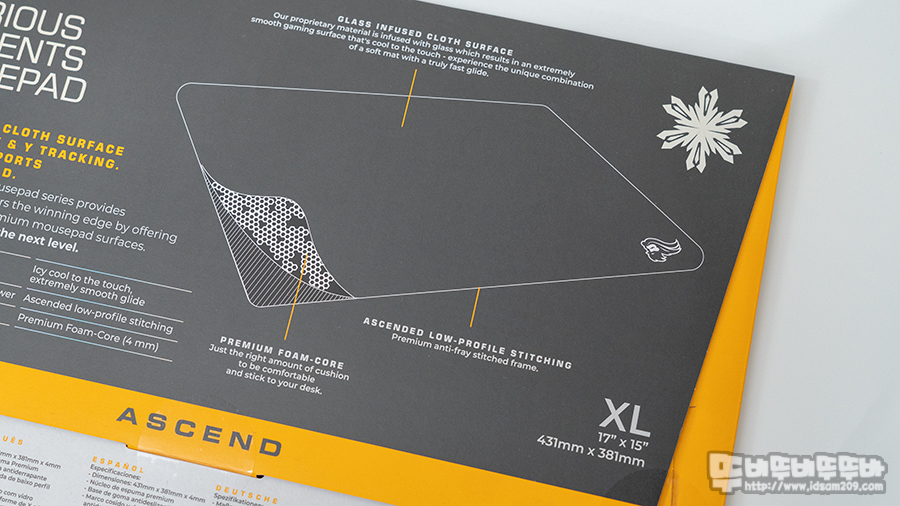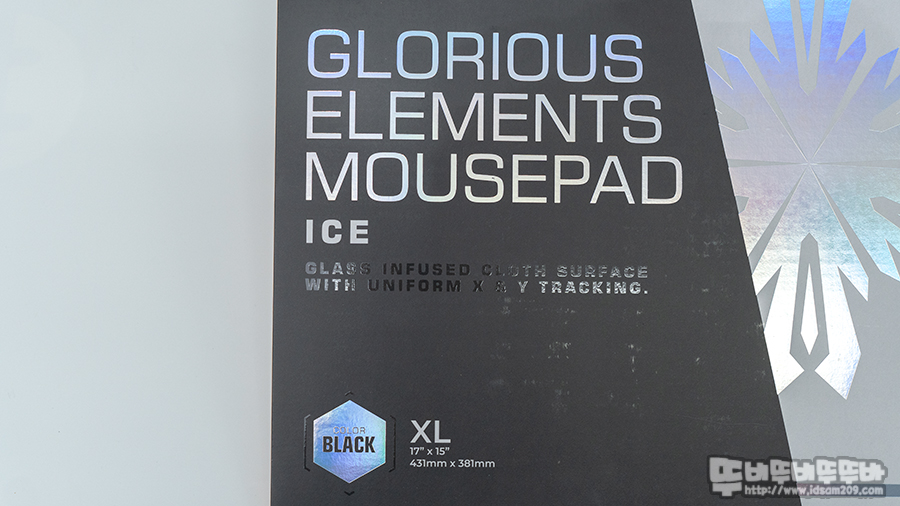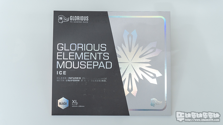 ICE 패키지의 아이콘은 눈 결정체를 표현하는 아이콘으로 유리를 주입한 천 표면으로 균일한 X & Y 트래킹을 지원한다는 내용과 패드 크기가 431mm X 381mm XL 사이즈임을 강조하고 있습니다.