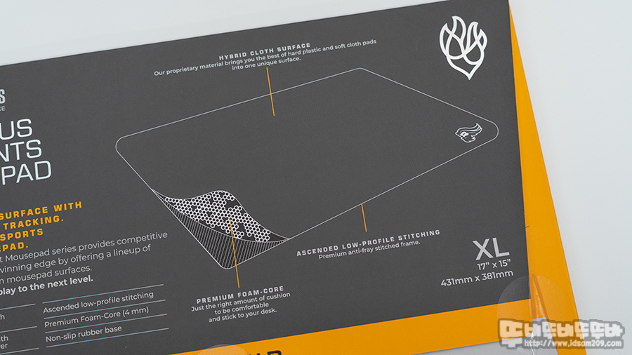 FIRE 패키지의 아이콘은 불을 형상화한 아이콘으로 하이브리드 천을 사용하여 균일한 X & Y 트래킹을 지원한다는 내용과 패드 크기인 431mm X 381mm XL 사이즈임을 강조하고 있습니다.