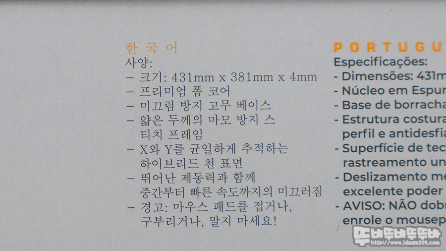 ICE 패드는 실측 사이즈 가로 431mm X 세로 381mm, 두께 4mm (스티치 마감으로 약 +3mm 정도 차이가 있음)로 마우스 무빙에 넉넉한 XL 사이즈로 디자인되었으며 표면이 일반적인 열가공 처리된 텍스쳐 천보다도 곱고 슬라이딩이 강한 게 특징인데요.