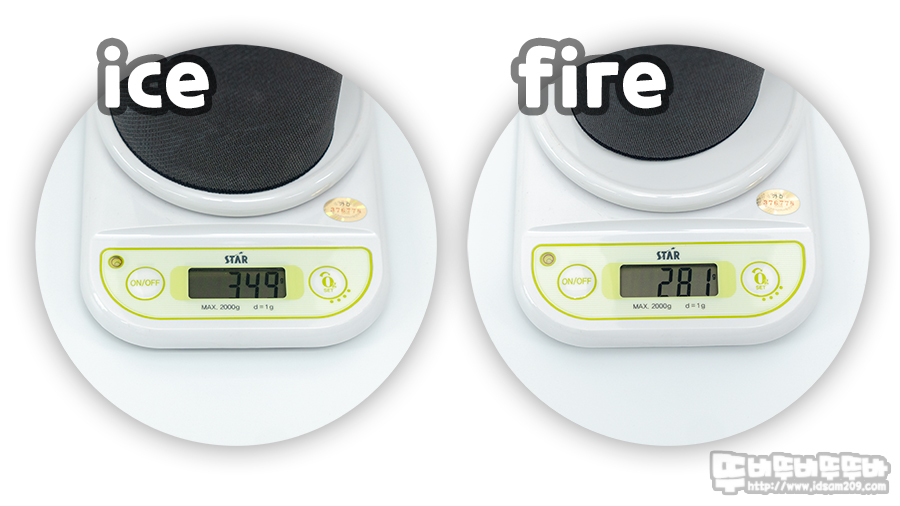 스펙 정보에서 ICE 패드 325g, FIRE 패드 320g의 무게로는 큰 차이가 나지 않지만 손을 들었을 땐 무게 차이가 많이 나는 느낌이 들어 패드를 동그랗게 말아 얇은 종이테이프로 감아 고정 후 세워서 무게 측정을 해보니 ICE 패드 349g, FIRE 패드 281g 무게로 확인되네요.