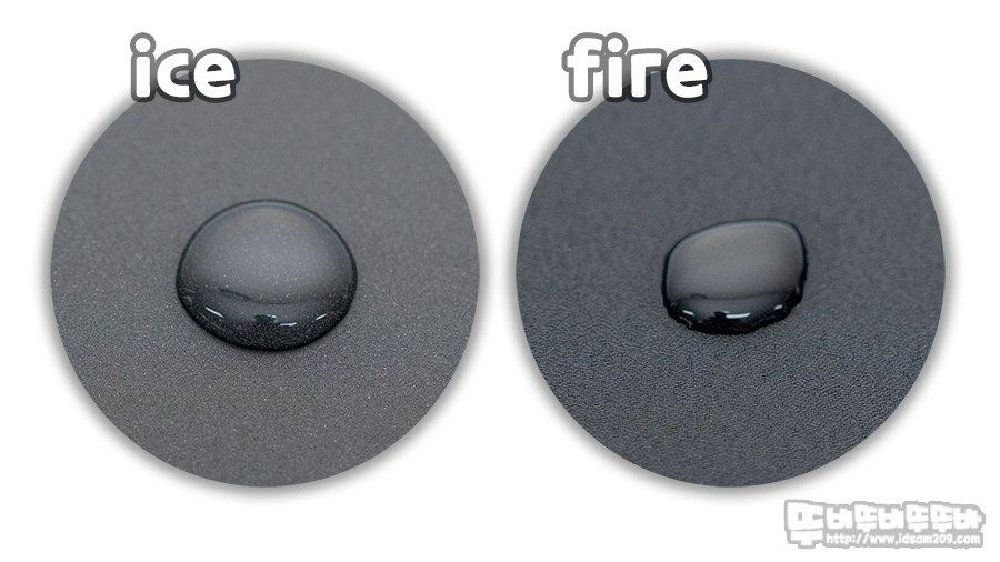 발수 코팅에 대한 언급은 없지만 혹시나 하는 맘에 ICE와 FIRE 패드 표면에 물을 떨어 뜨려 발수 테스트를 해보았습니다.