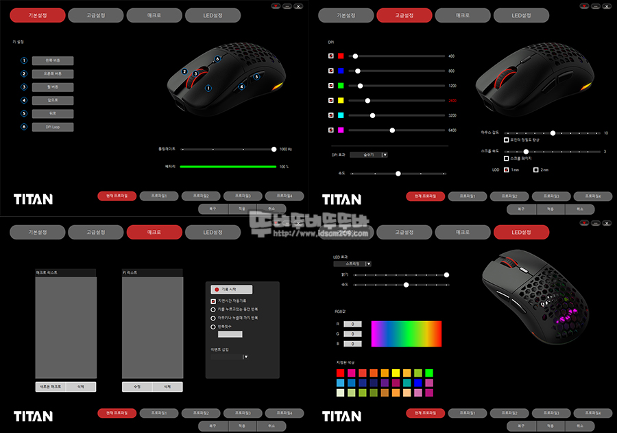 - 고급설정 : DPI 단계, DPI 값, DPI 컬러 설정 및 마우스 감도, 휠 스크롤 속도, L.O.D 선택
