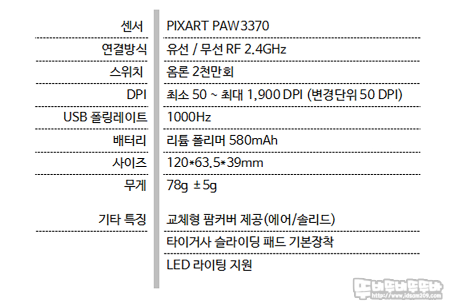 게이밍에 최적화된 저전력 센서인 PIXART PAW3370이 사용된 제닉스 타이탄 GX Air 무선 마우스는 교체가 가능한 팜 커버 제공, 마우스 내부에 리시버 휴대 가능, 리튬폴리머 배터리 사용으로 최대 70시간 사용이 가능한 제품인데요.