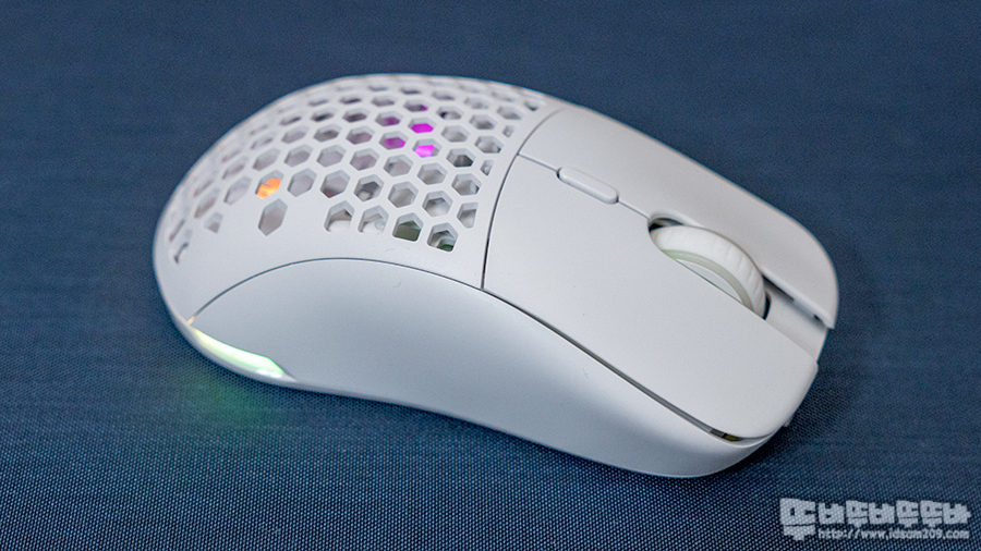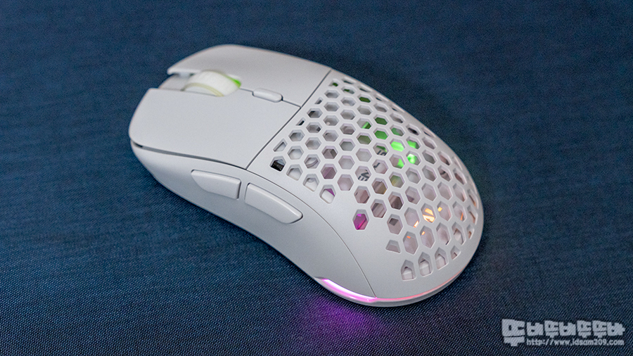 대칭형이지만 사이드 버튼이 왼쪽에 위치한 오른손 전용 마우스로 마우스 팜 부분을 허니컴 타공으로 디자인된 타공 커버가 기본으로 장착되어 시원한 느낌을 주며 취향에 따라 교체 파트로 제공되는 솔리드 커버로 사용 가능합니다.