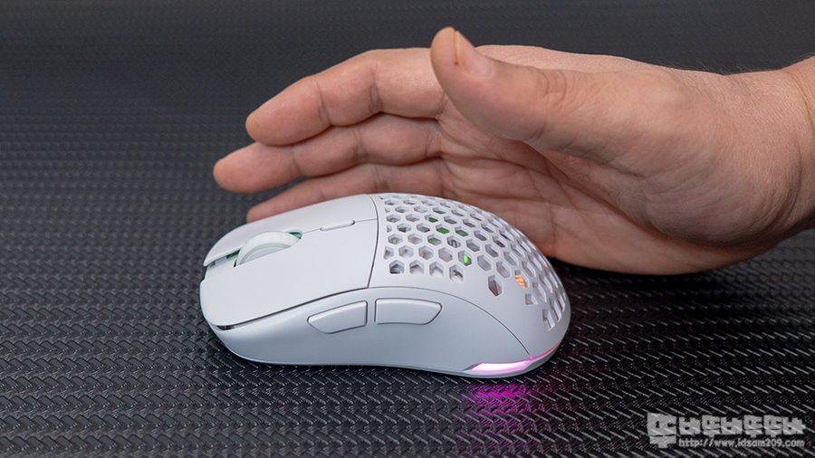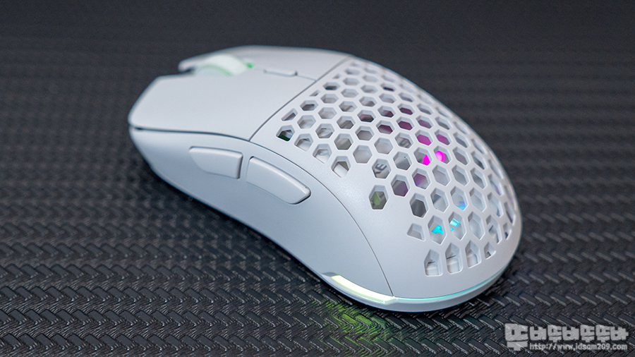 대칭형이지만 사이드 버튼이 왼쪽에 위치한 오른손 전용 마우스로 마우스 팜 부분을 허니컴 타공으로 디자인된 타공 커버가 기본으로 장착되어 시원한 느낌을 주며 취향에 따라 교체 파트로 제공되는 솔리드 커버로 사용 가능합니다.