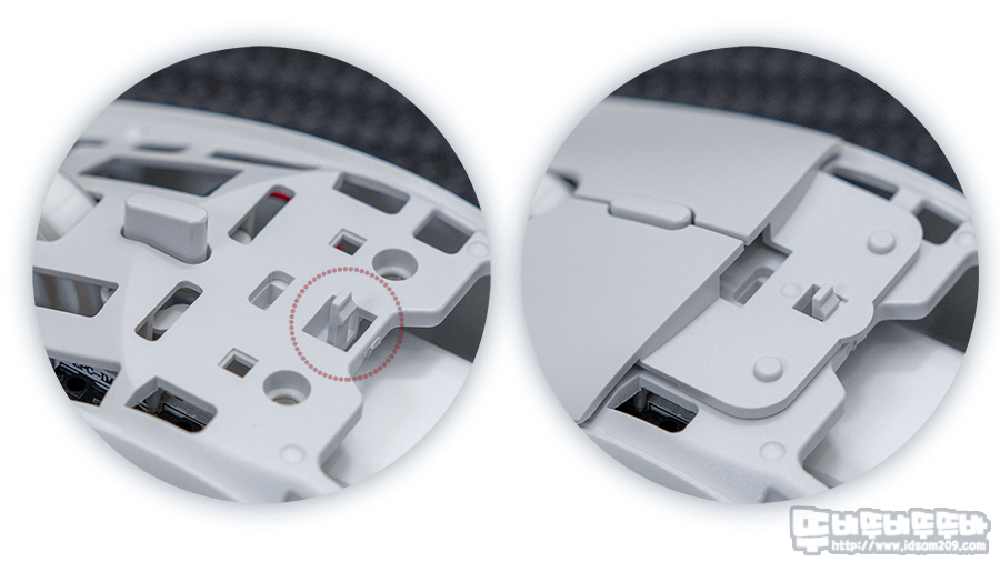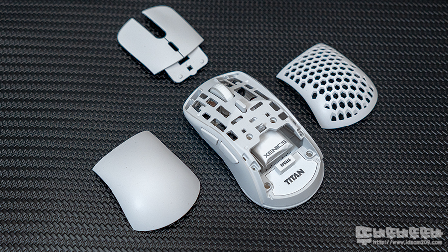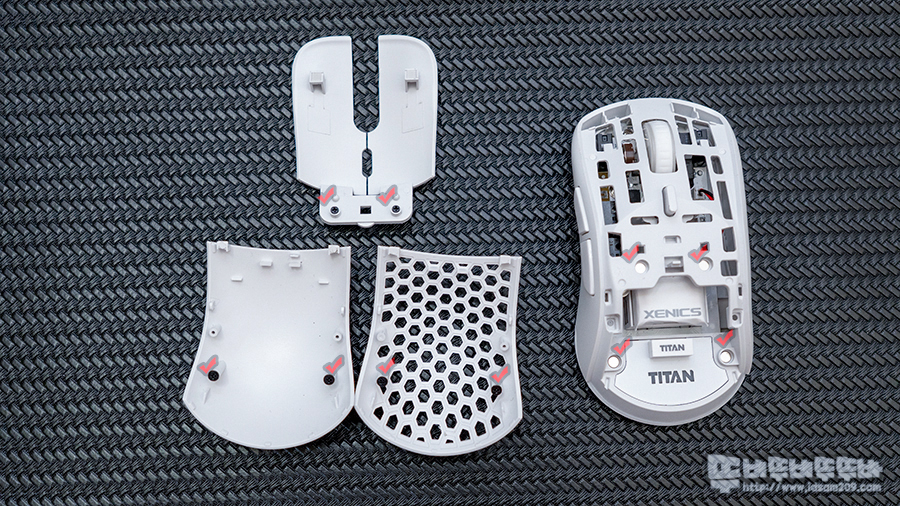 제닉스 타이탄 GX Air 마우스는 마우스 상단 버튼 부분과 팜 커버는 마우스 하우징의 내장된 자석 베이스에 커버 안쪽의 금속 나사가 결합하는 방식으로 편리하게 탈부착할 수 있게 디자인되었습니다.