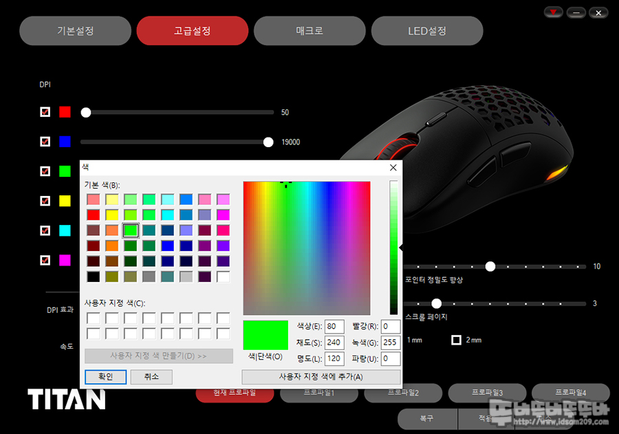 그에 따른 DPI LED는 컬러는 컬러 박스를 선택하여 변경할 수 있으며 기본값 기준으로 소프트웨어에 지정된 컬러는 확인할 수 있습니다.