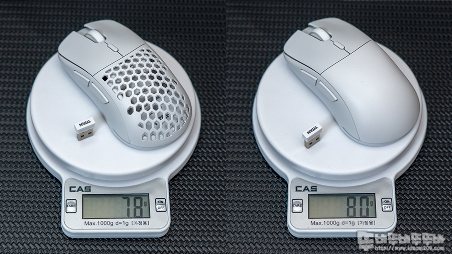 스펙상의 무게는 73±5g으로 표기되고 있지만, 리시버를 포함 시 타공 팜 커버 사용 시 78g, 솔리드 팜 커버 사용 시 80g의 무게를 리시버를 제거 후 측정 시 76g, 78g임을 확인할 수 있었습니다.