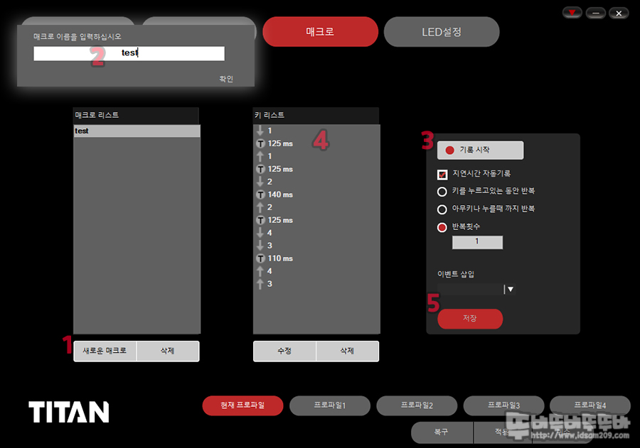 매크로 이름 생성 - 기록 시작 - 키 입력 - 기록 종료 - 저장 순으로 진행하게 되며 이벤트 삽입 기능을 추가하여 마우스 버튼 기능을 이용할 수 있는데요.