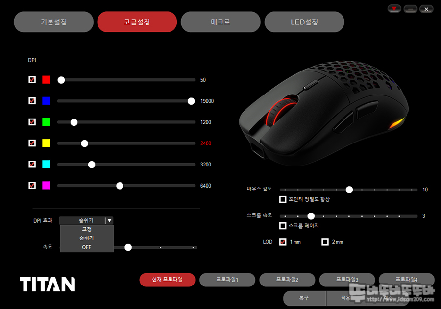 고급 설정에서는 6개의 DPI 단계 설정의 값, LED 컬러 선택이 가능하며 1mm와 2mm 지정된 L.O.D 선택이 가능하며
