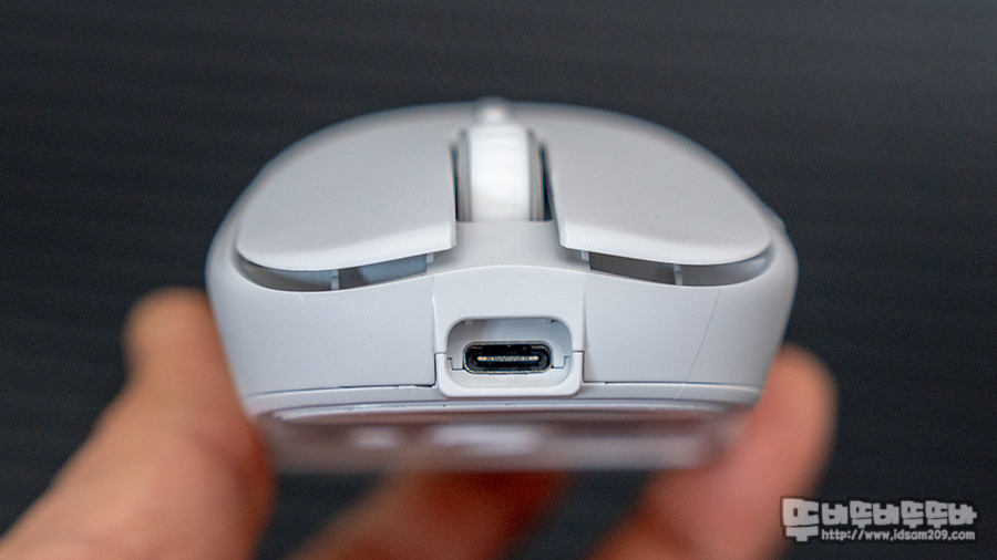 제닉스 타이탄 GX Air 타공 무선 게이밍 마우스는 대칭형 유선 모델인 GX Air 외형과 동일하며 대부분 무선 제품이 그러하듯이 전면에 충전 겸 유선 사용이 가능한 USB-C 케이블이 장착 가능한 USB-C 소켓을 사용한 것 특징입니다.