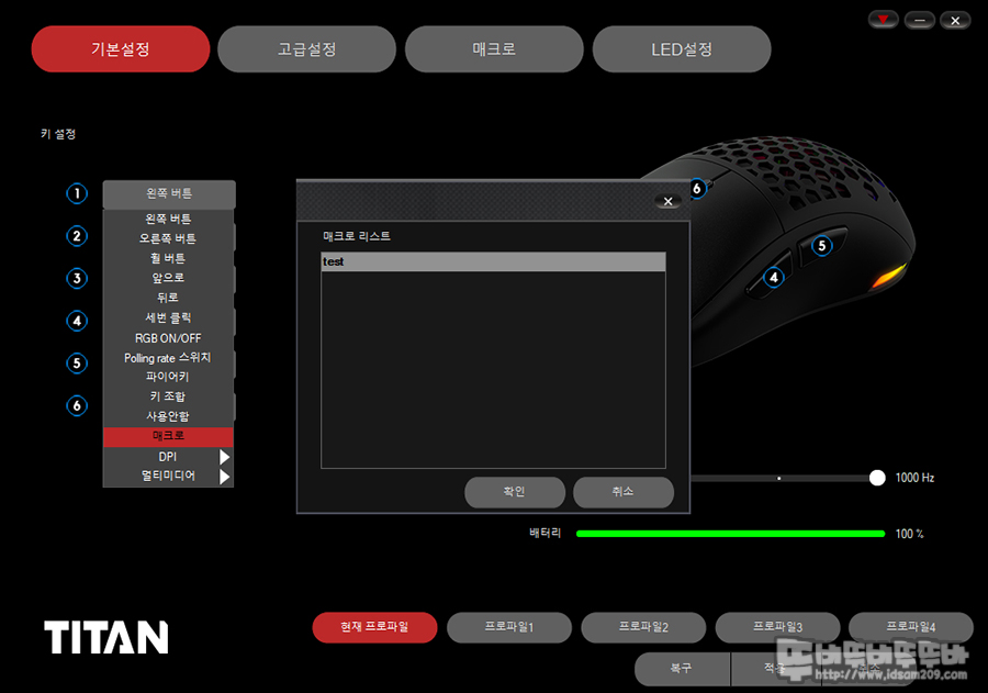 - 기본 설정 : 버튼 기능, USB 폴링 레이트, 배터리 잔량 표시