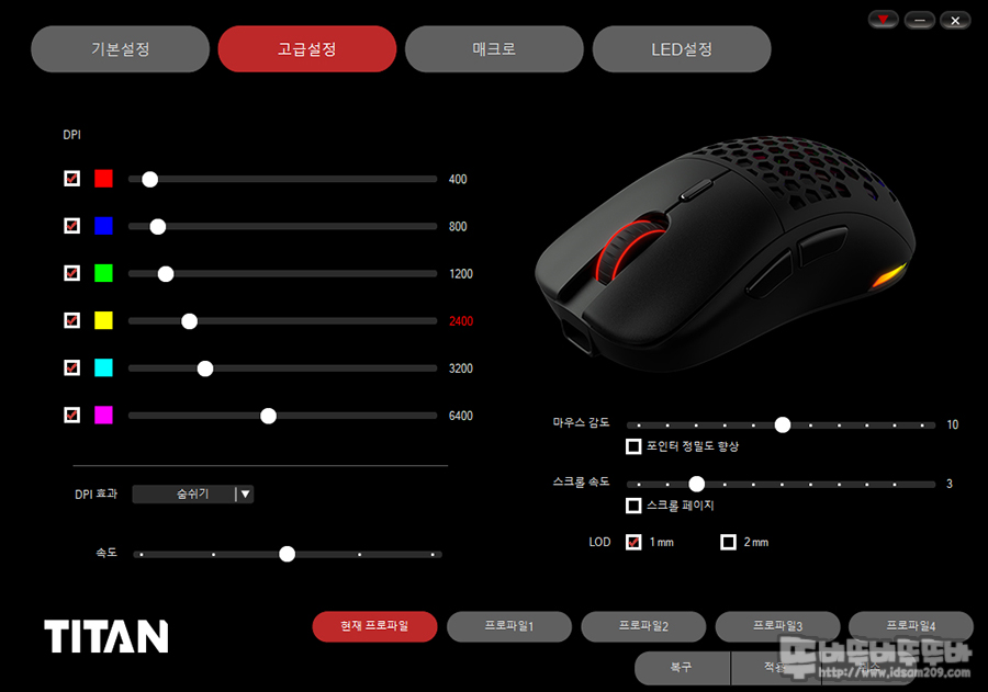 - 고급설정 : DPI 단계, DPI 값, DPI 컬러 설정 및 마우스 감도, 휠 스크롤 속도, L.O.D 선택