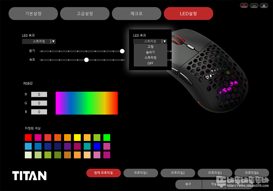 DPI LED 효과를 표현하는 "DPI 효과" 메뉴에서 숨쉬기와 고정 효과로 선택이 가능하니 취향에 맞게 사용하시기 바랍니다.