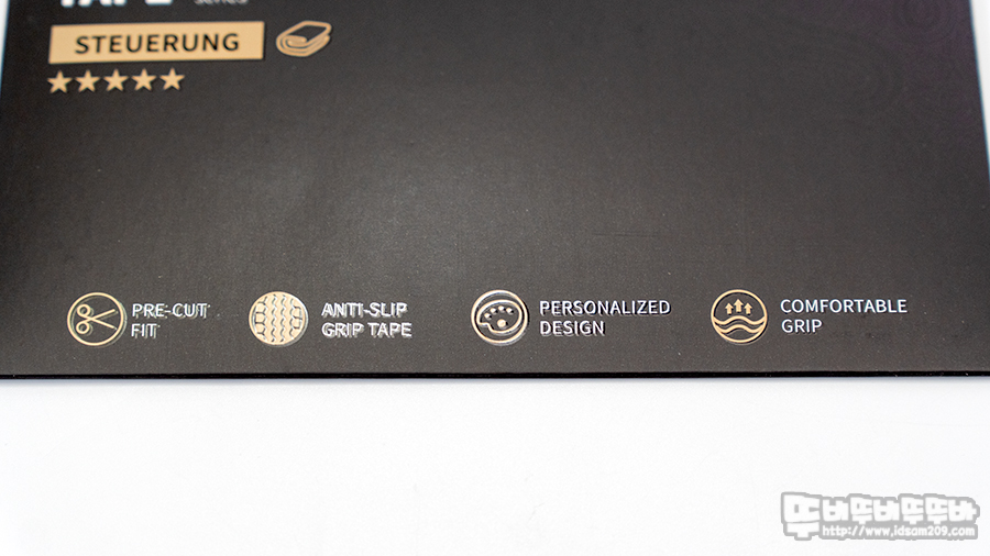 DIY가 아닌 제품에 맞게 커팅된 맞춤형 디자인, 미끄럼 방지 그립 테이프, 편안한 그립을 지원하는 특징을 표현하고 있습니다.