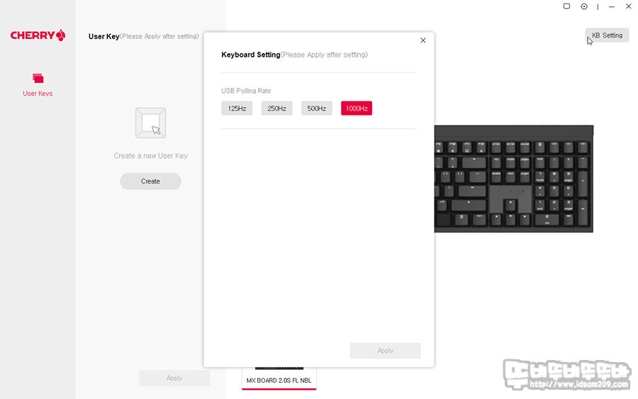 우측의 KB Setting 메뉴를 통해 USB 폴링 레이트 세팅이 가능하니 참고하시고요.