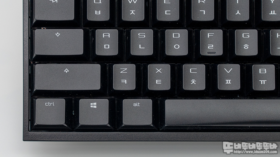 레이저로 각인된 폰트는 영문과 한글이 세로로 배열되어있으며 F 키와 J 키는 손가락 위치를 구분하는 돌기가 적용되어있습니다.