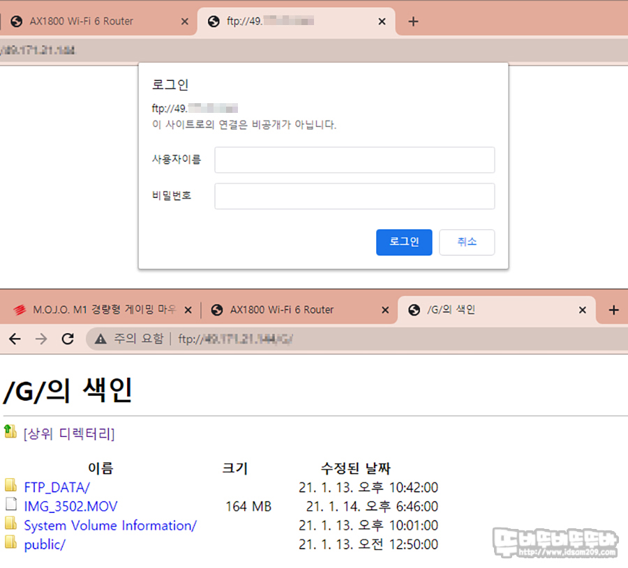 인터넷 FTP 설정 후 공인 IP로 접속한 모습.
